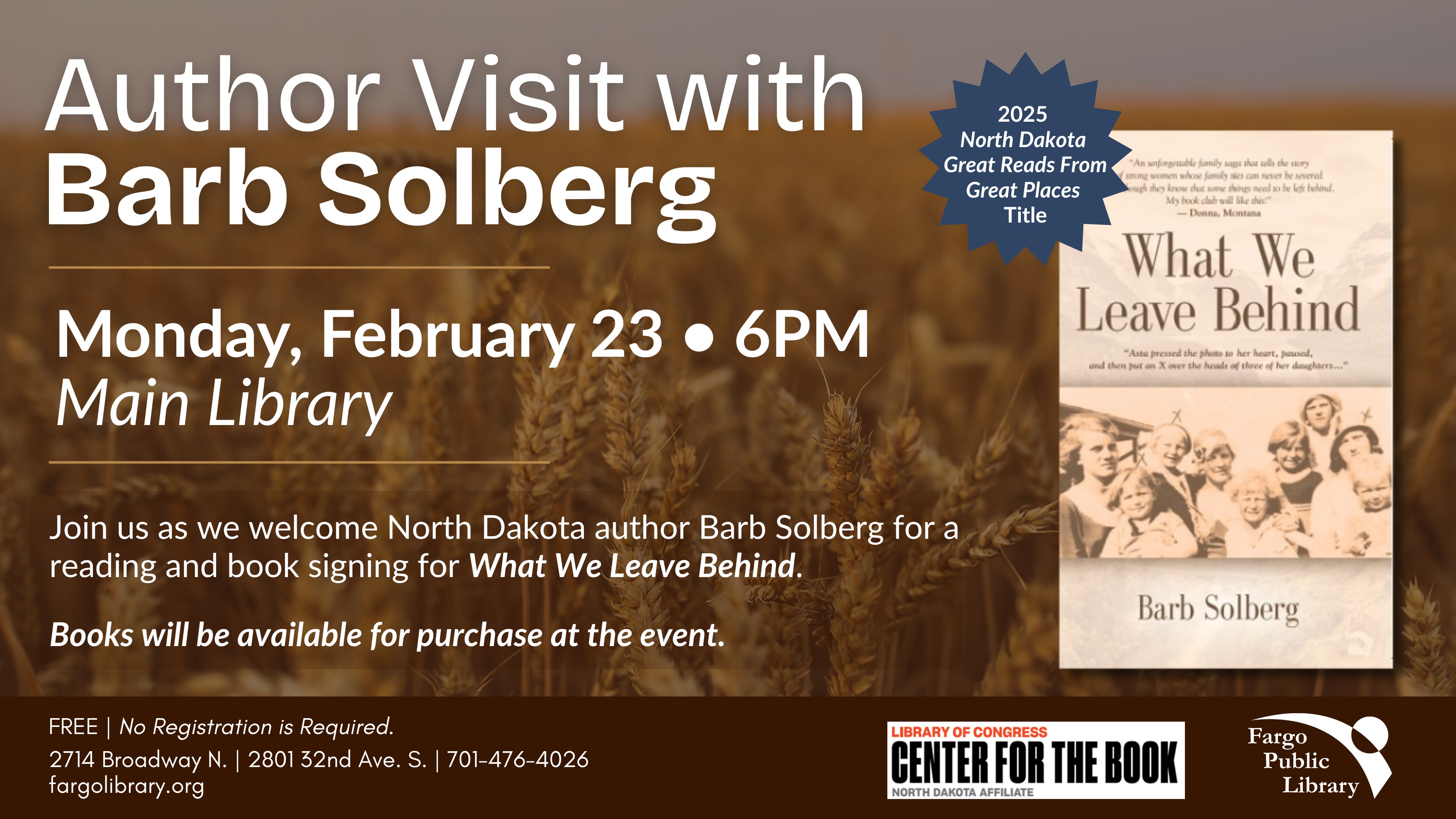 Solberg’s 2022 historical novel focuses on Norwegian immigrants who come to America in pursuit of a better life, and is based on Solberg's own ancestors. She will discuss the origins of her book, as well as the writing and publishing process. “What We Leave Behind” was selected as a 2025 North Dakota Great Reads from Great Places at the National Book Festival, sponsored by the Library of Congress and the North Dakota Center for the Book. A book signing will follow. Books will be available for purchase, and no registration is required for this free event. Contact Lori at 701.476.5977 for additional details.