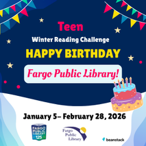 Teens are invited to take part in the 2026 Winter Reading Challenge "Happy Birthday, Fargo Public Library" from January 5 to February 28, 2026. The Winter Reading Challenge is free and open to all reading levels. Track your reading to earn prizes. Log on to the Fargo Public Library’s Beanstack App to chart your progress beginning Monday, January 5. Paper reading logs are also available at all FPL locations.